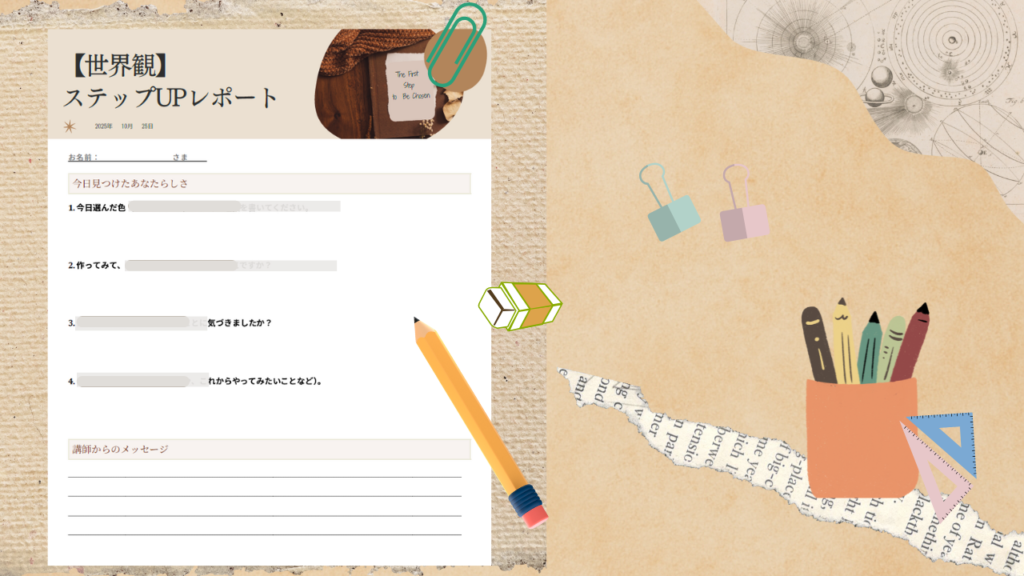 完成後は「世界観ステップUPレポート」に気づきをまとめ、後日、講師のフィードバック付きPDFをお届けします。